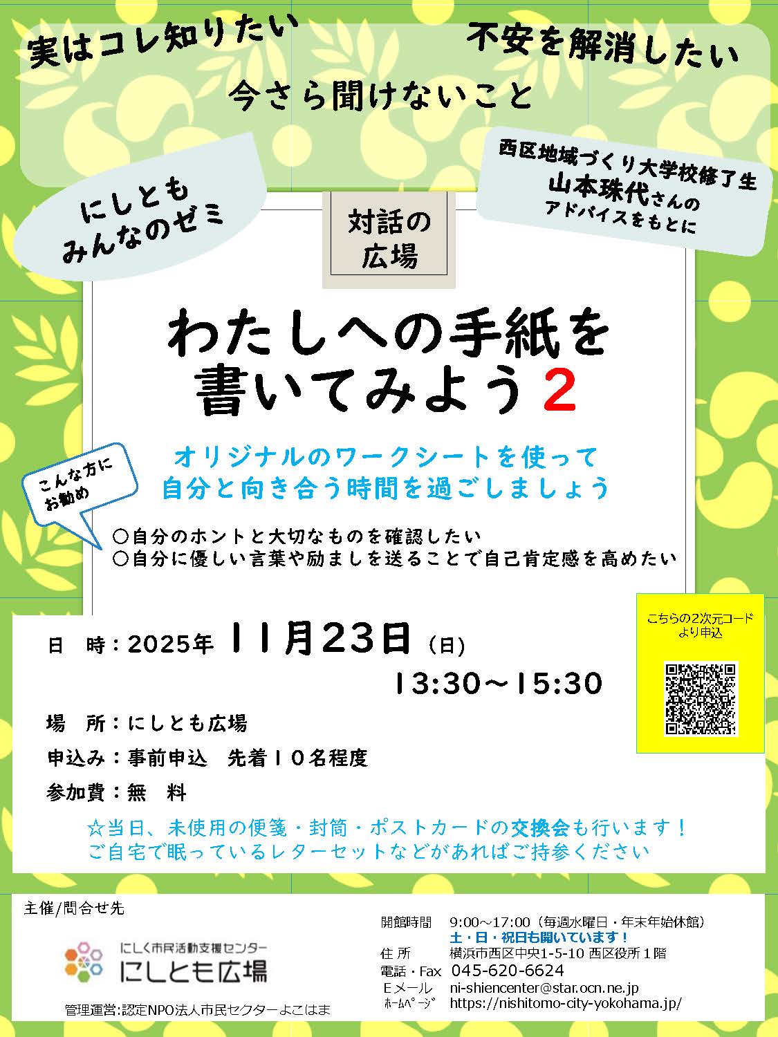 にしく市民活動支援センター ”にしとも広場” (区役所1階 杉山神社前)