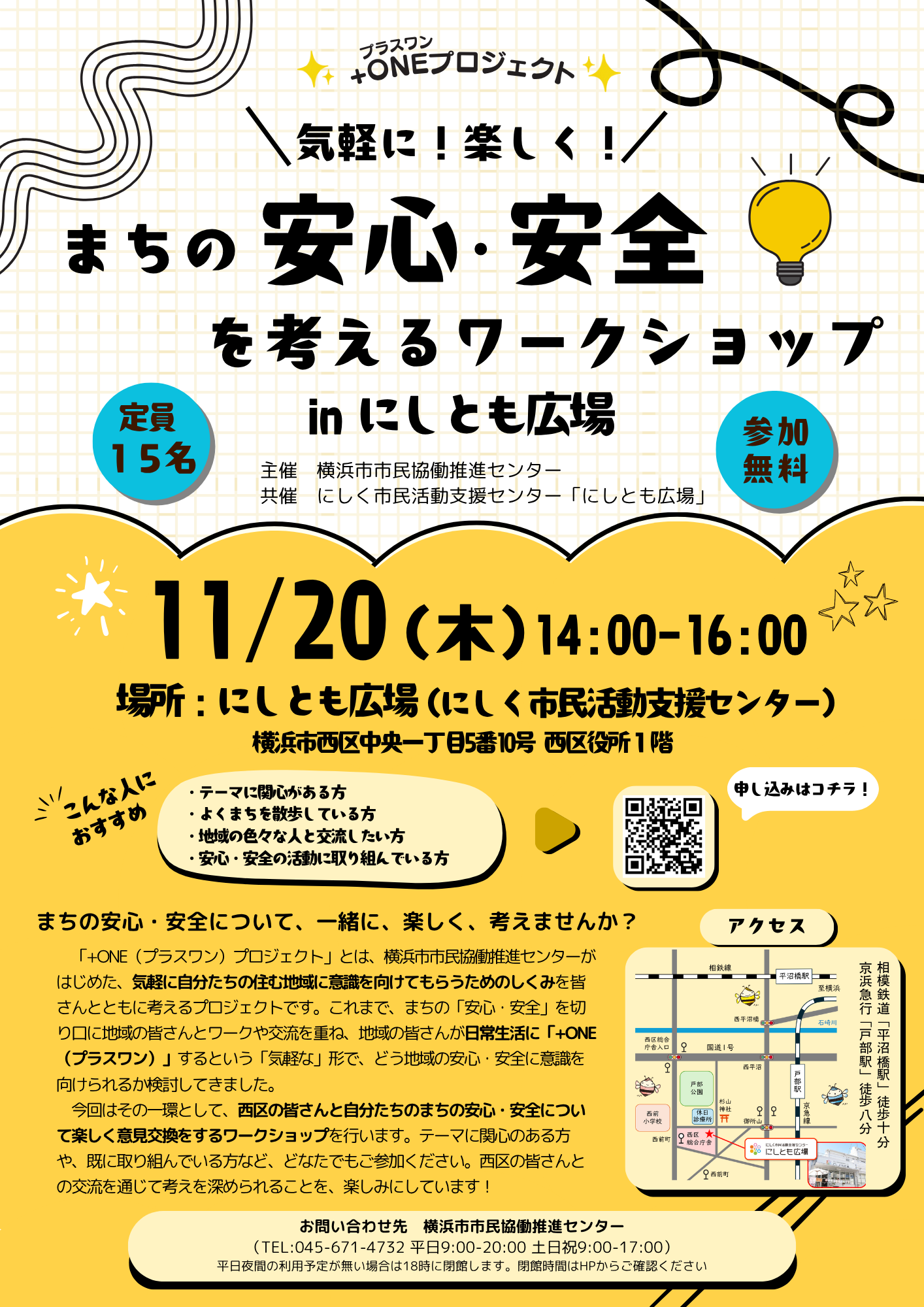 今回は、西区に暮らす皆さんと、安心・安全なまちづくりについて、気軽に楽しく意見交換できるワークショップを開催します。皆さんの日常生活に安心・安全を「+ONE(プラスワン)」できるアイデアが、きっと見つかるはずです!