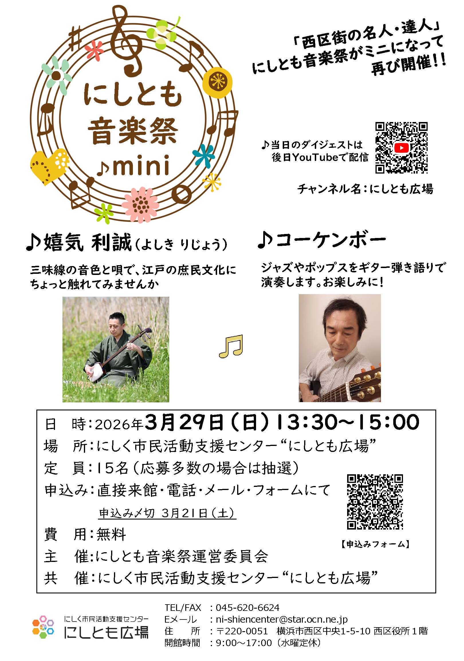 「西区街の名人・達人」による「にしとも音楽祭mini」を今年も開催します!