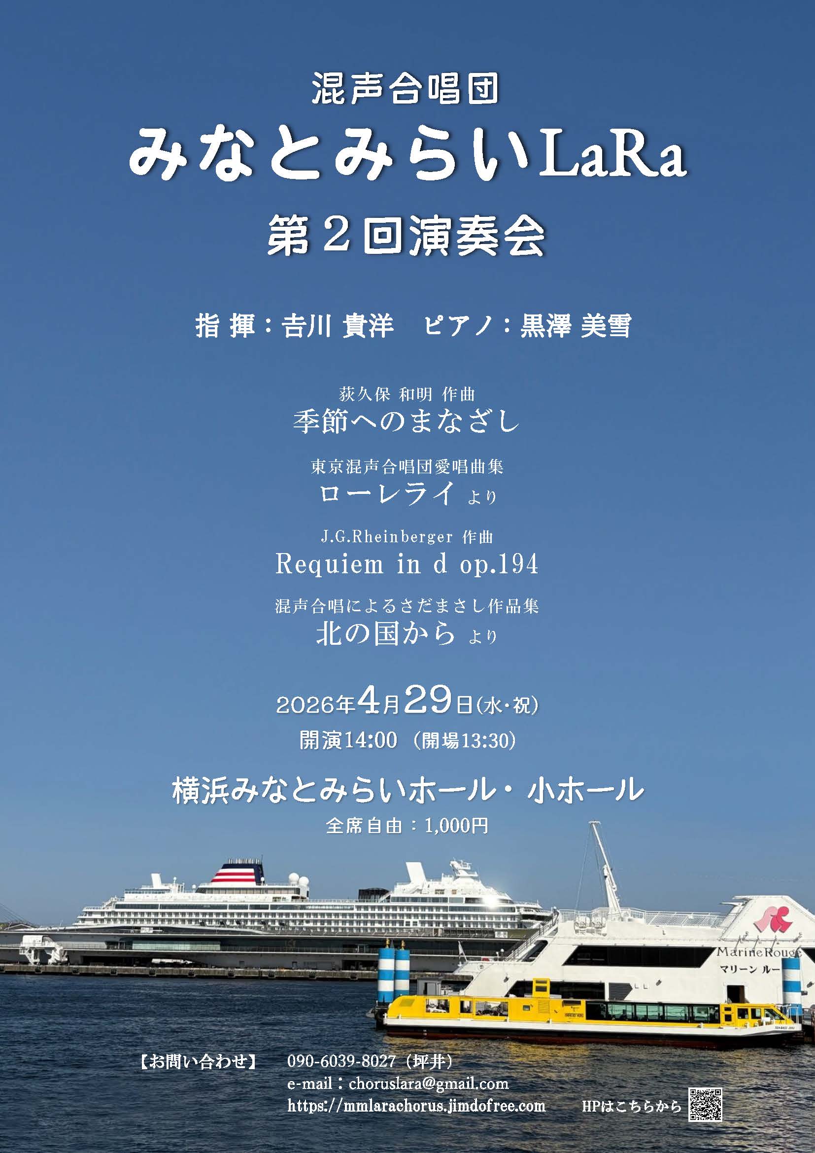 混声合唱団 みなとみらいLaRa 第2回演奏会 活動団体からのお知らせ 2026.04.29 活動団体からのお知らせ 日時 2026年4月29日(水・祝)開演14:00 (開場13:30) 場所 横浜みなとみらいホール(小ホール) 入場料 1000円(全席自由) 主催・問合せ 混声合唱団みなとみらいLaRa 問合せ:choruslara@gmail.com